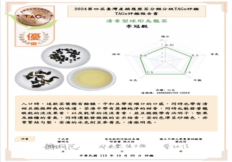 在2024年10月舉辦的第四屆台灣產銷履歷茶品質分類分級TAGs評鑑中,茶毅思的沁玉烏龍茶脫穎而出,榮獲「優選」等級,展示出其卓越的品質與獨特的風味。這款清香型球形烏龍茶不僅在風味上獨具一格,還呈現了茶葉品種、製作工藝以及種植環境相互融合的完美結果,成為眾多烏龍茶中的亮點。
